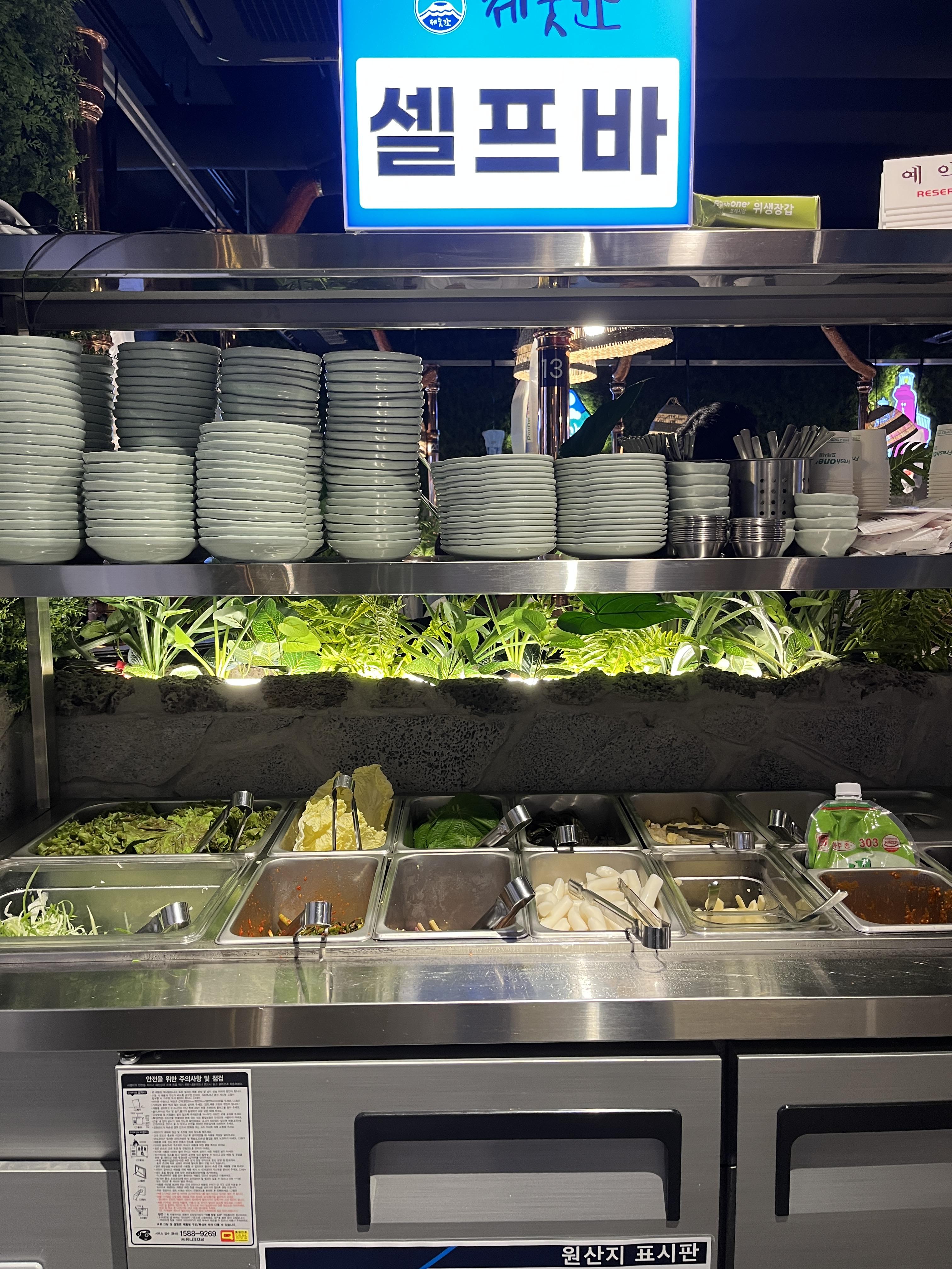 셀프바에는 싱싱한 상추, 쌈배추, 파채, 깻잎과 같은 야채들과 김치, 슬라이스마늘, 구워먹을 떡, 고추냉이 등등