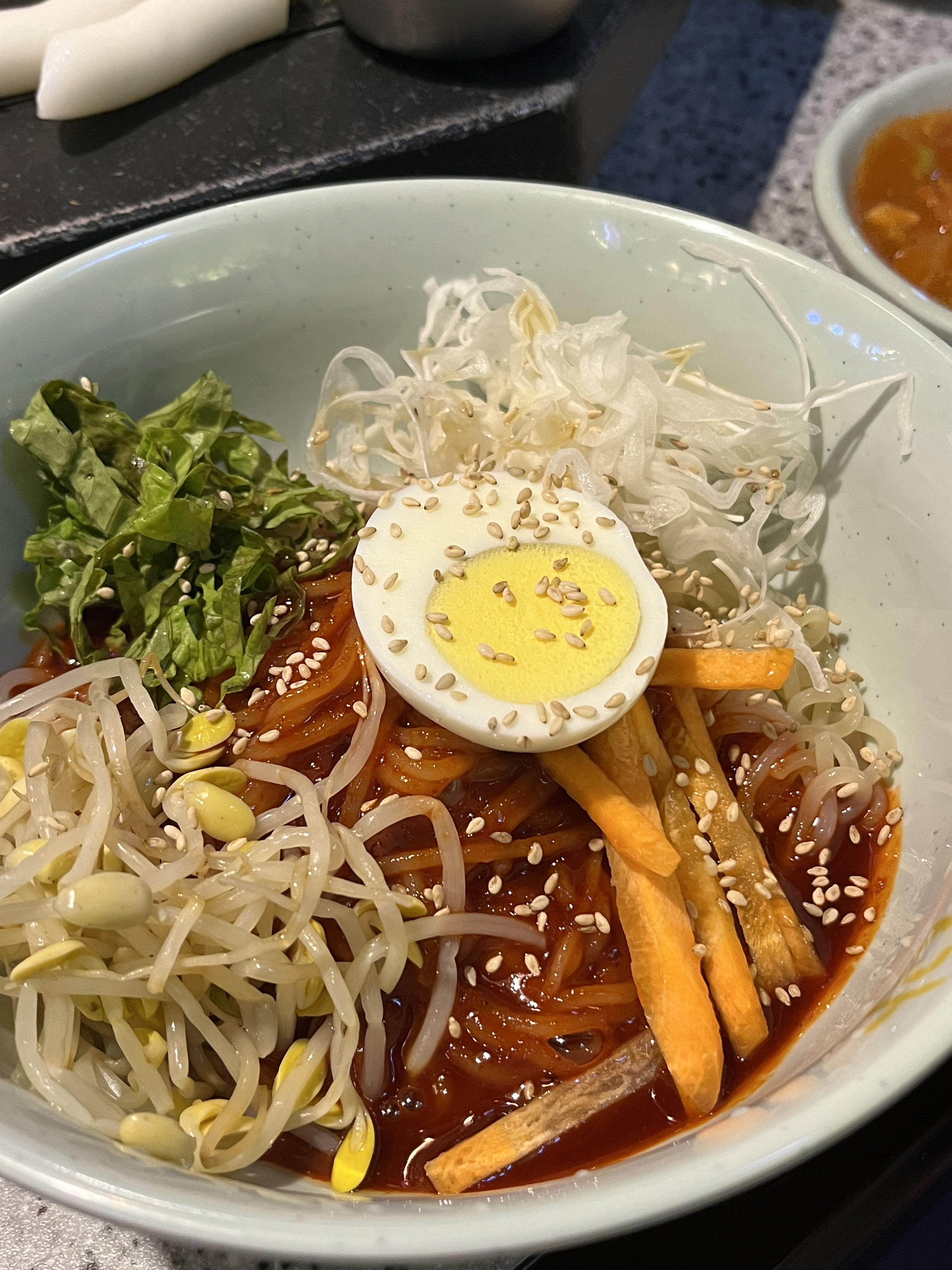 콩나물 양배추 상추 당근 삶은 계란이 들어있는 초고추장 듬뿍 쫄면입니다.