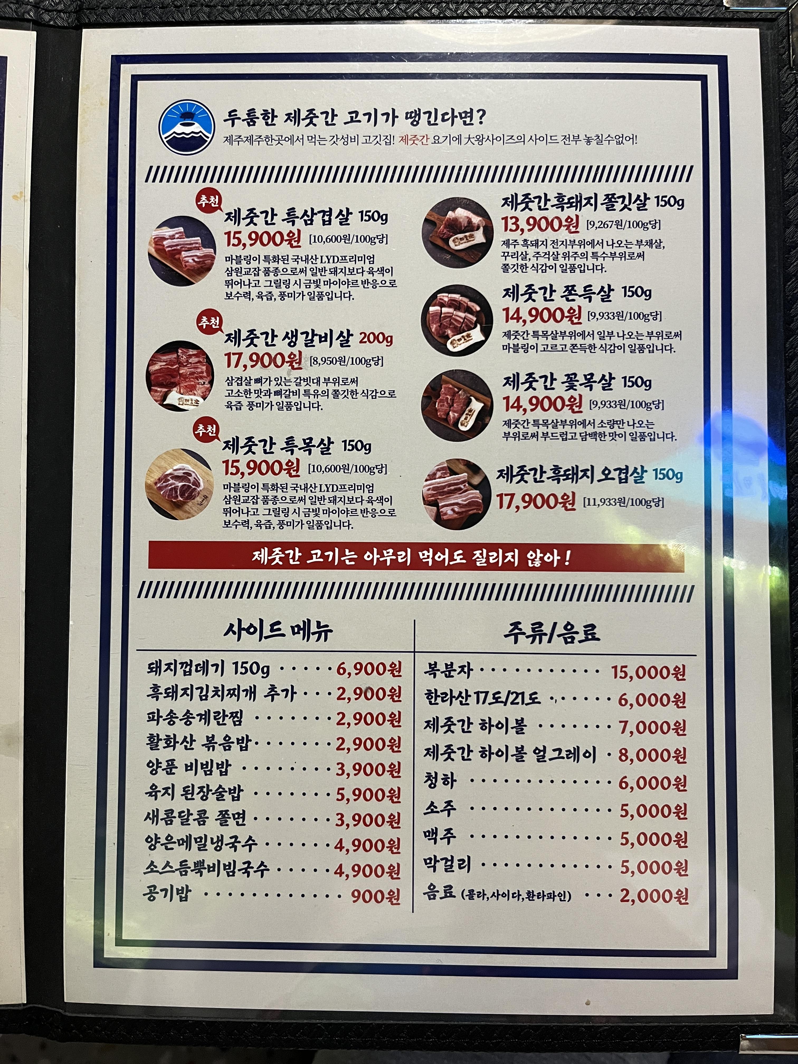 메뉴판에 써져있듯이 제줏간은 제주돼지고기 전문점으로 일반 삼겹살과 다르게 두툼한 두께로 나오는게 특징입니다.