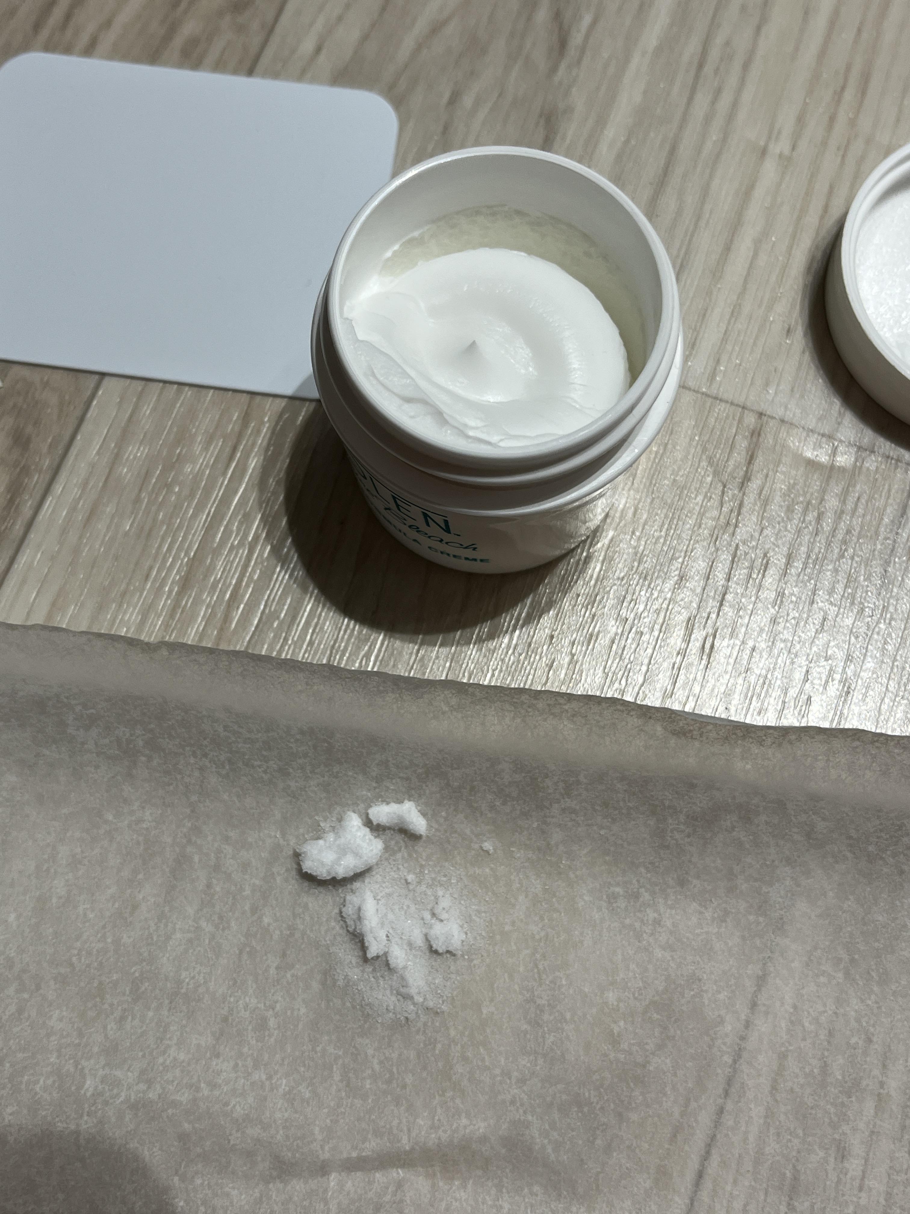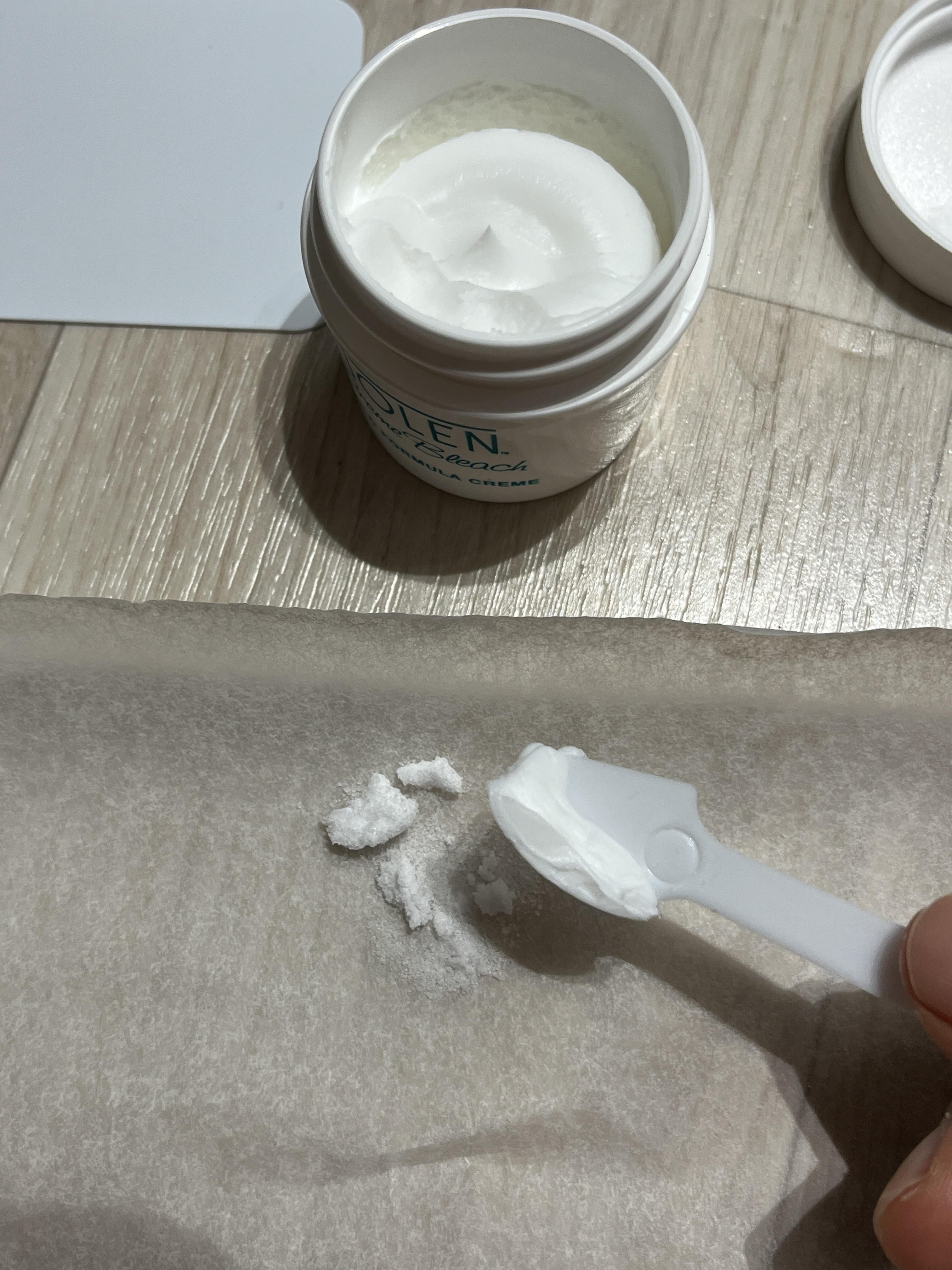2. 약 10~15분 후에 혼합크림을 주걱으로 제거하고 미지근한 물로 잘 헹군 후 비누나 샴푸로 깨끗이 씻는다.