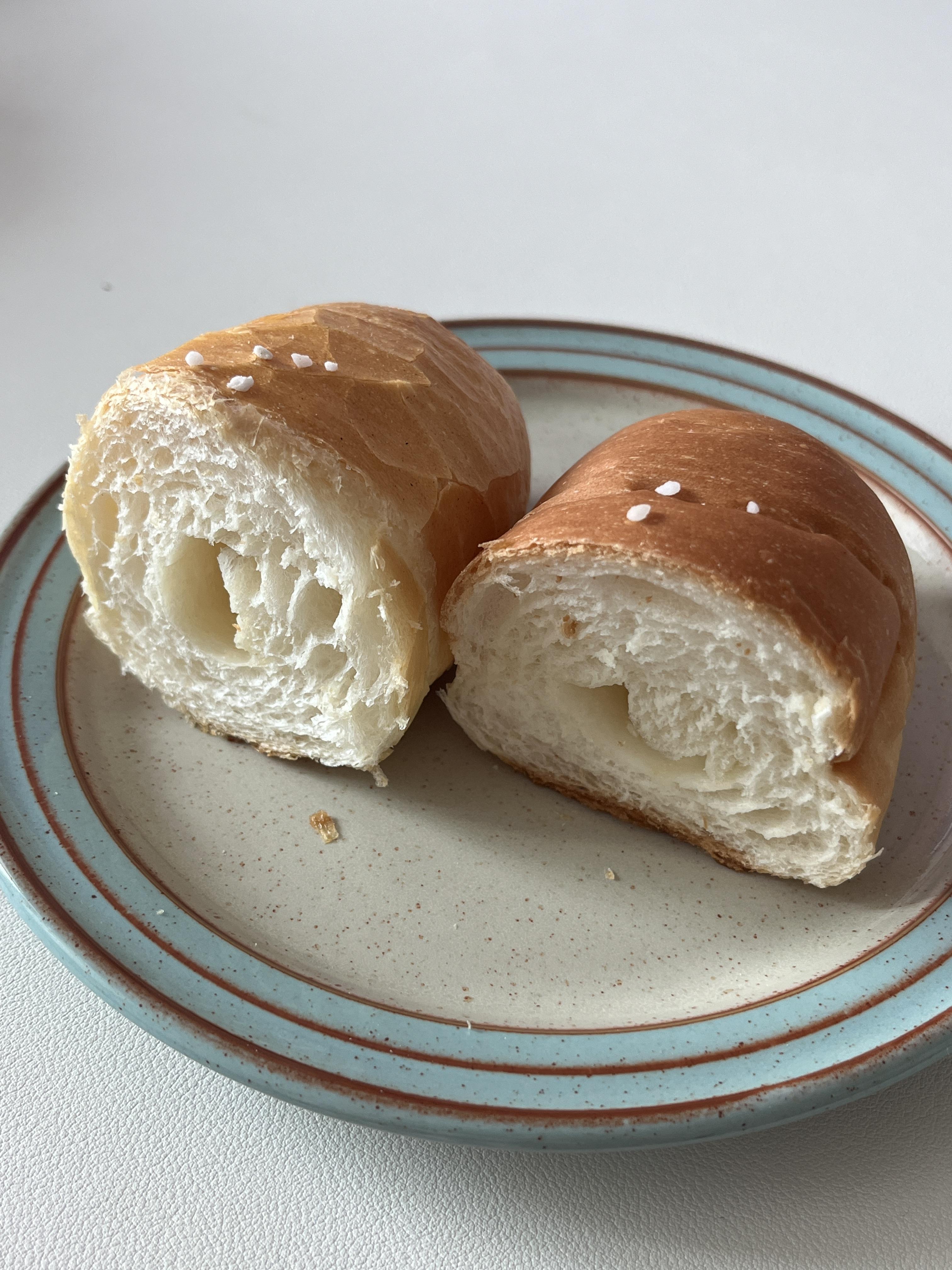 하드소금빵과 소프트소금빵을 반반씩 사이 좋게 잘라서 먹어보았습니다.