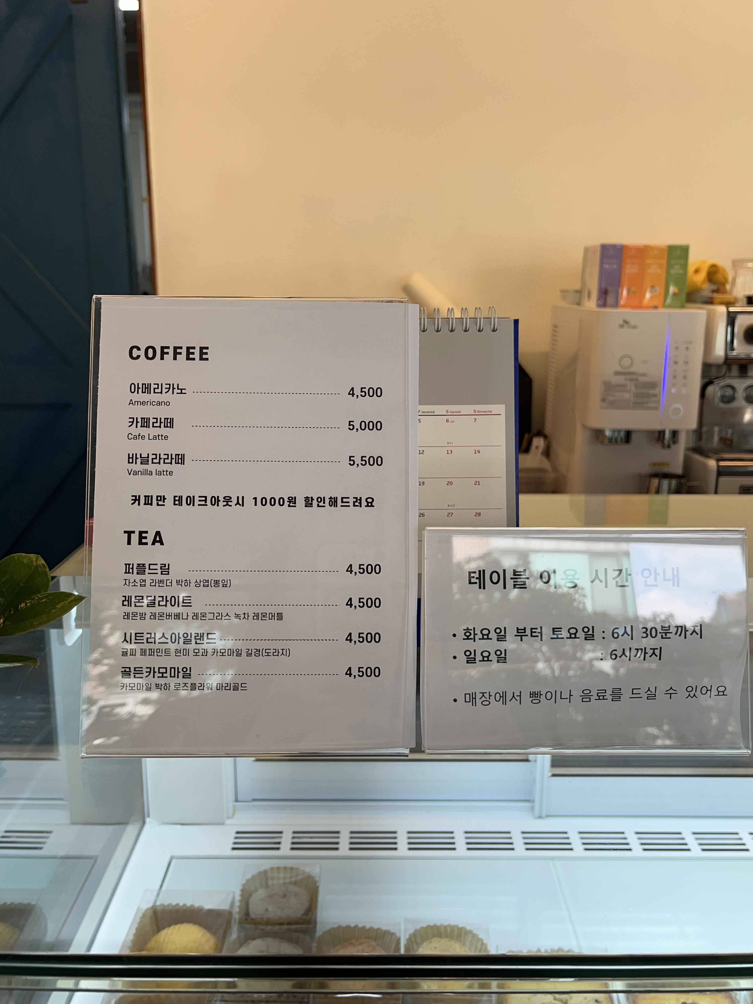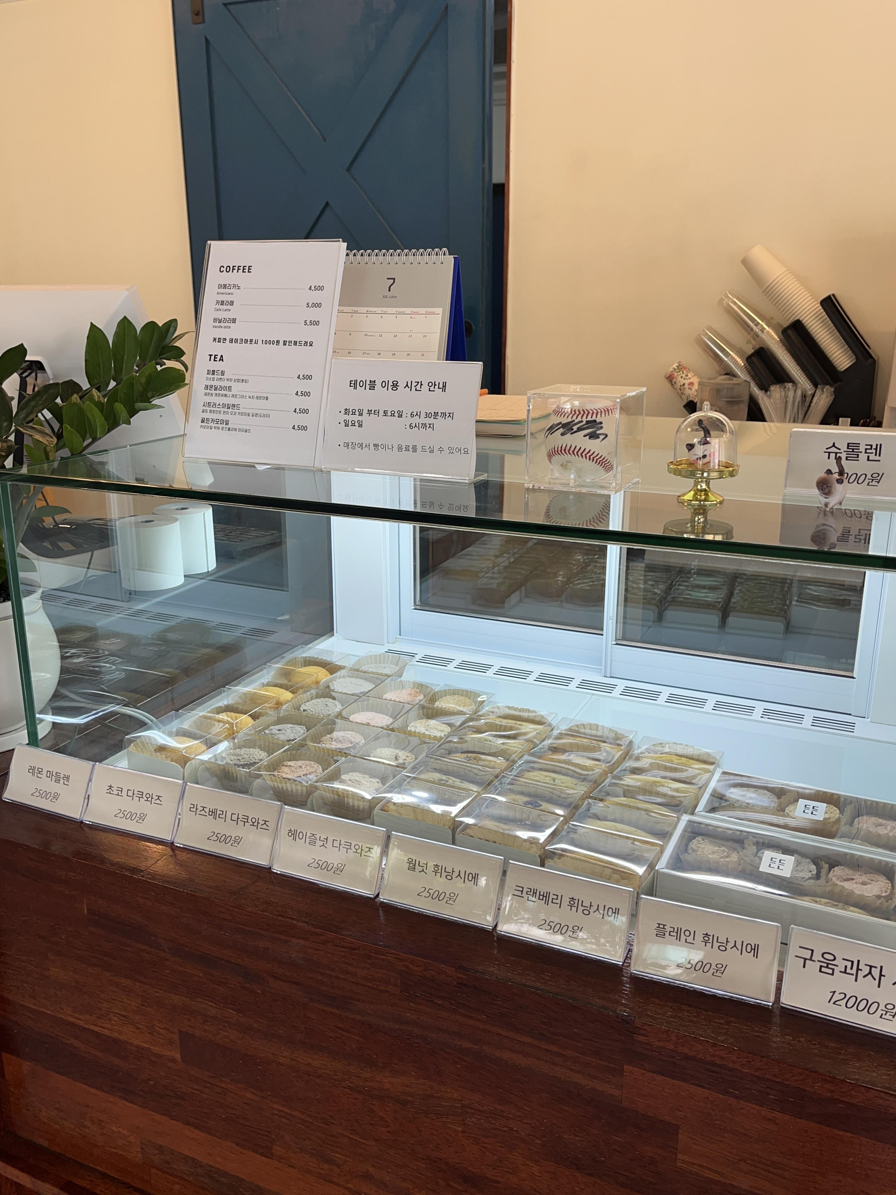 다쿠와즈 휘낭시에 구움과자 종류도 있고 커피 라떼 바닐라라떼 티 종류도 있었습니다.