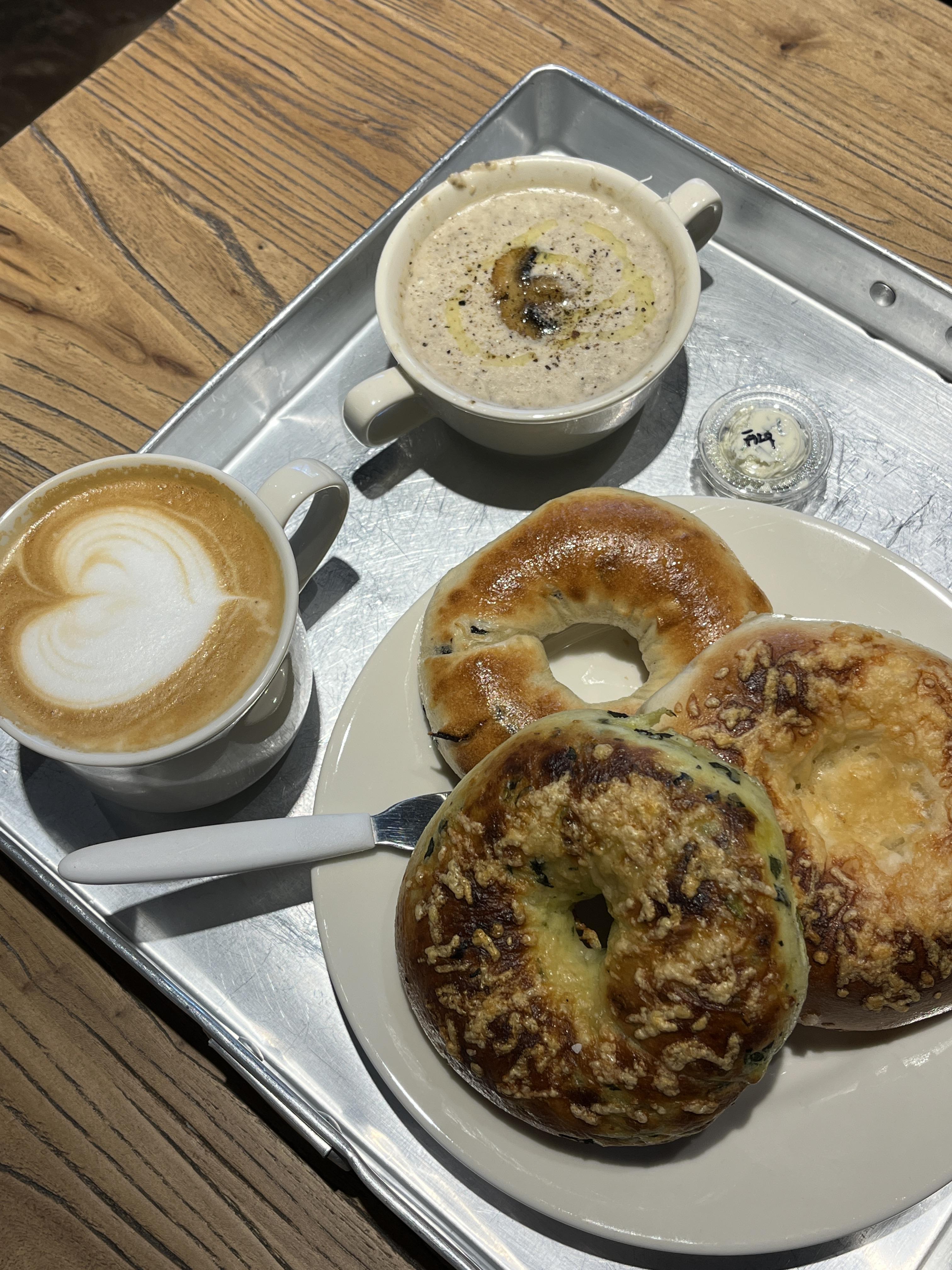 저는 오늘의 스프와 양파&올리브베이글, 포테이토 베이글, 시금치콜비잭 베이글, 따뜻한 라떼를 주문하였습니다.