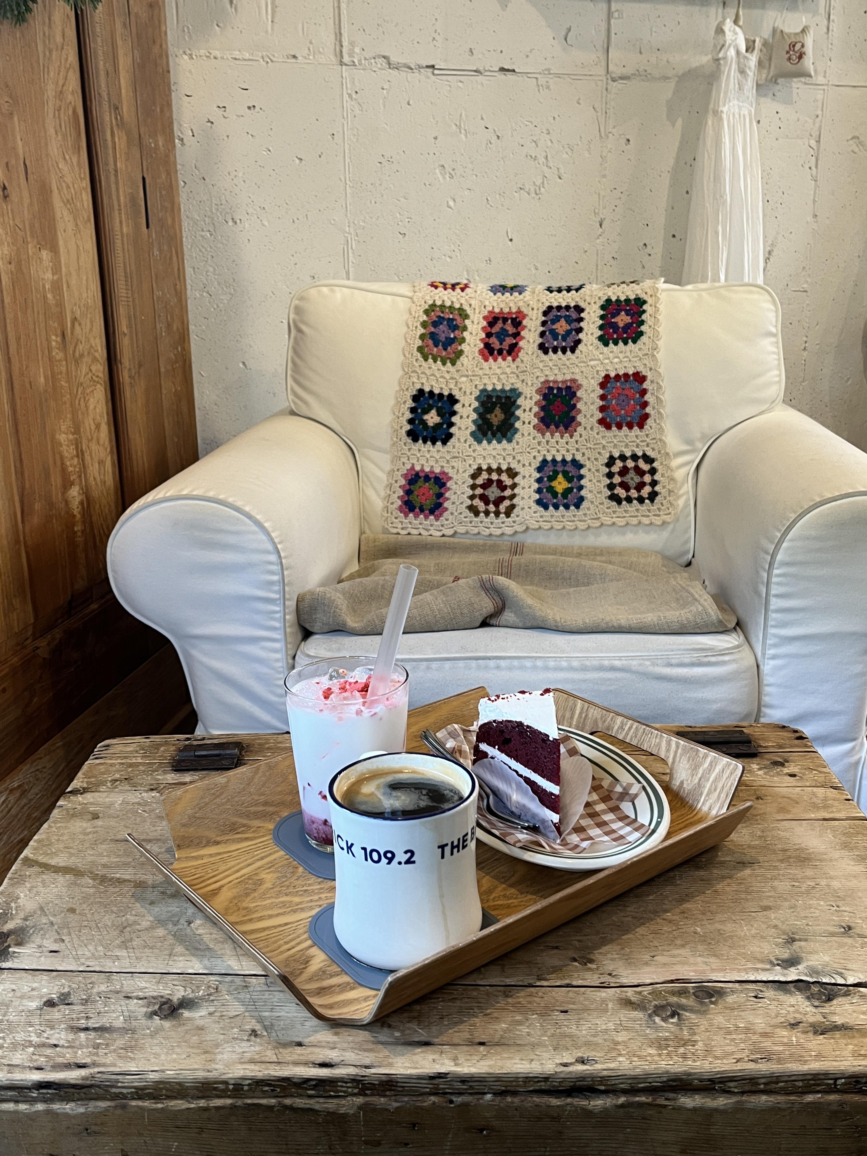 저는 오늘 따뜻한 아메리카노와 딸기우유와 레드벨벳 케이크를 주문하였습니다.