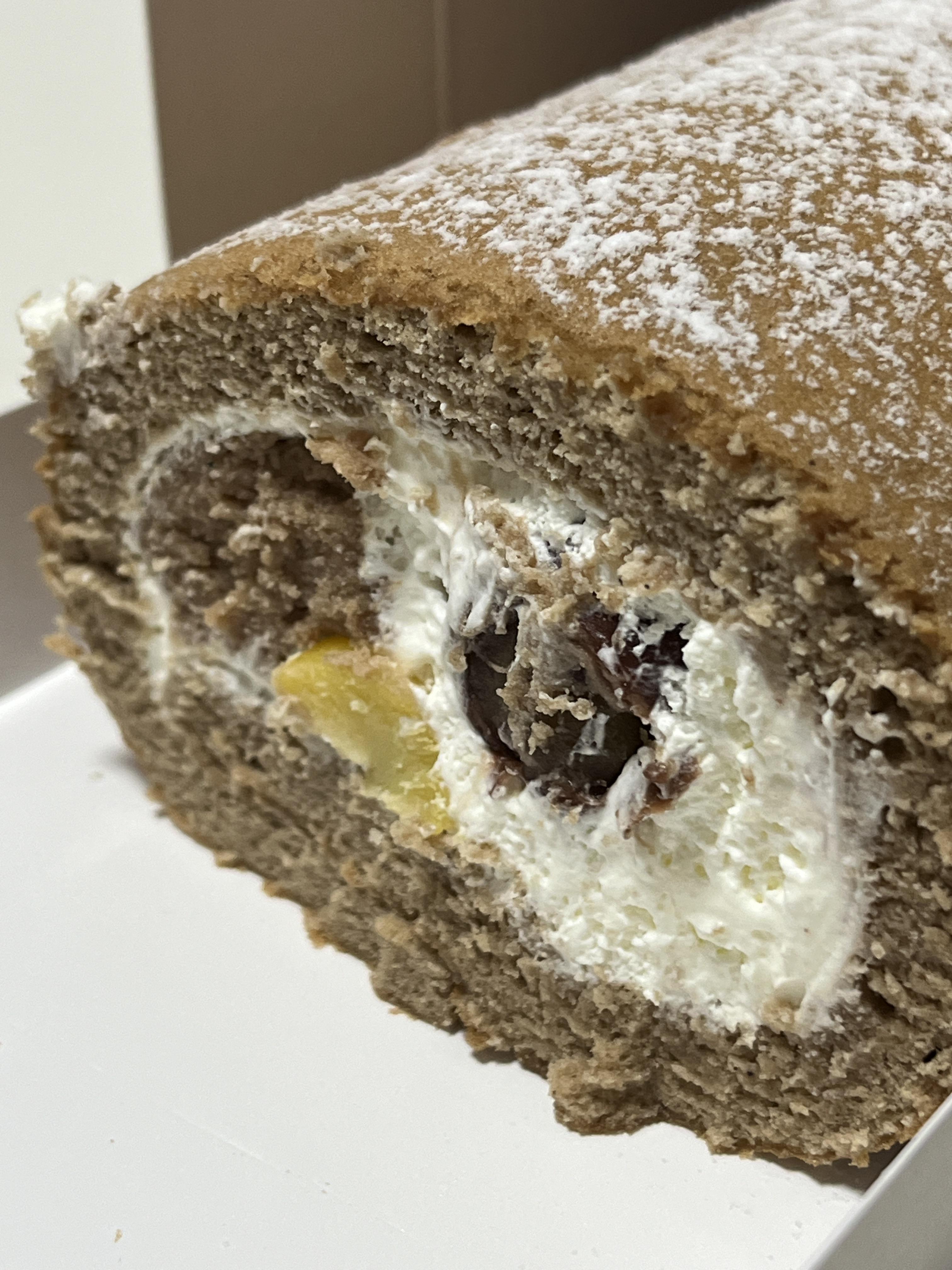 마론롤케이크 한쪽엔 밤무스가 있고 밤조각과 보늬밤알이 2~3개정도 들어가 있습니다.