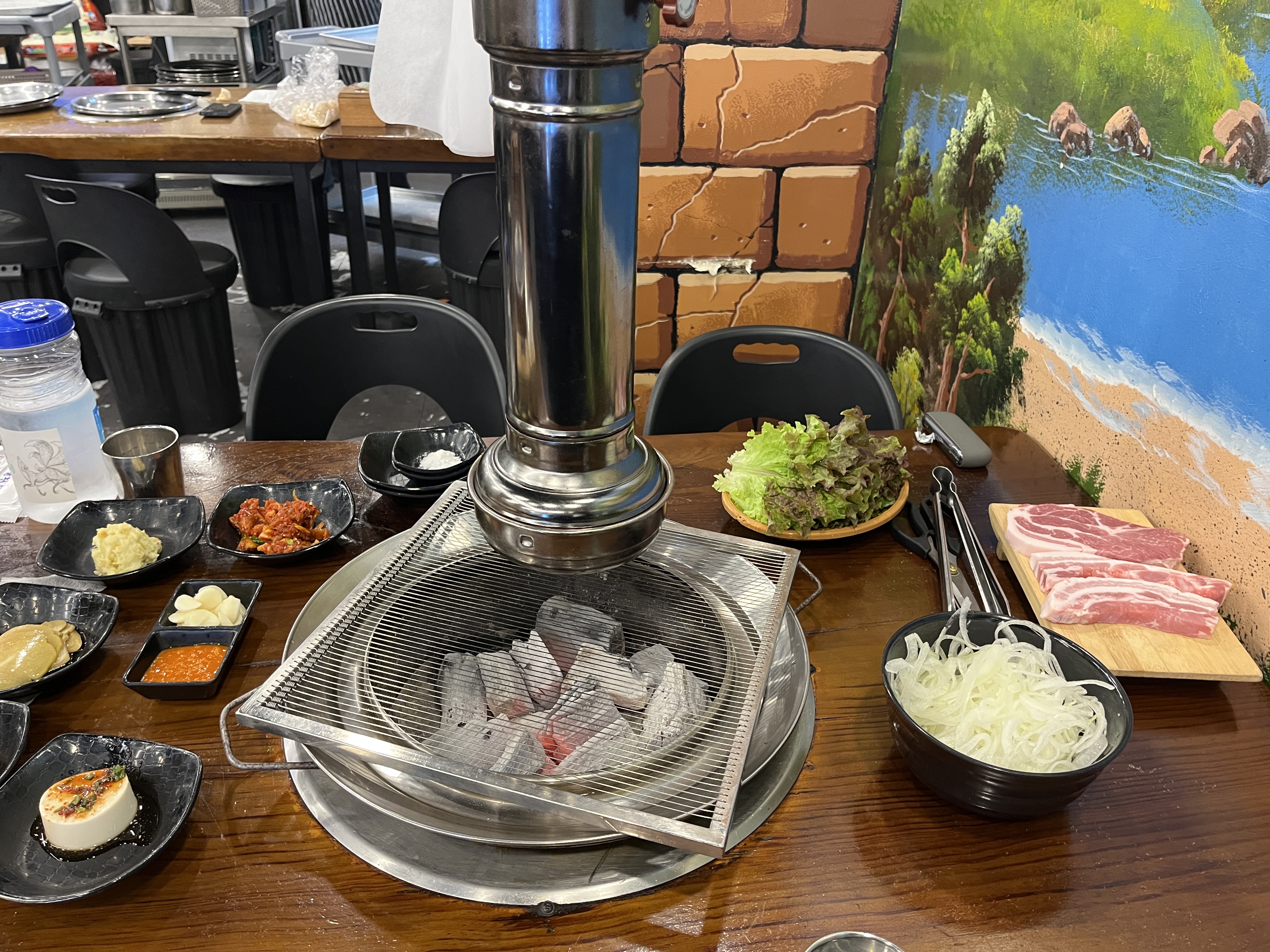 처음에 불이 약해서 목살에 식은땀이 나면서 수육처럼 되어가길래 숯불추가를 말씀드렸더니 뭔가 잘못된걸 아시고 얼른 추가해주셨습니다.