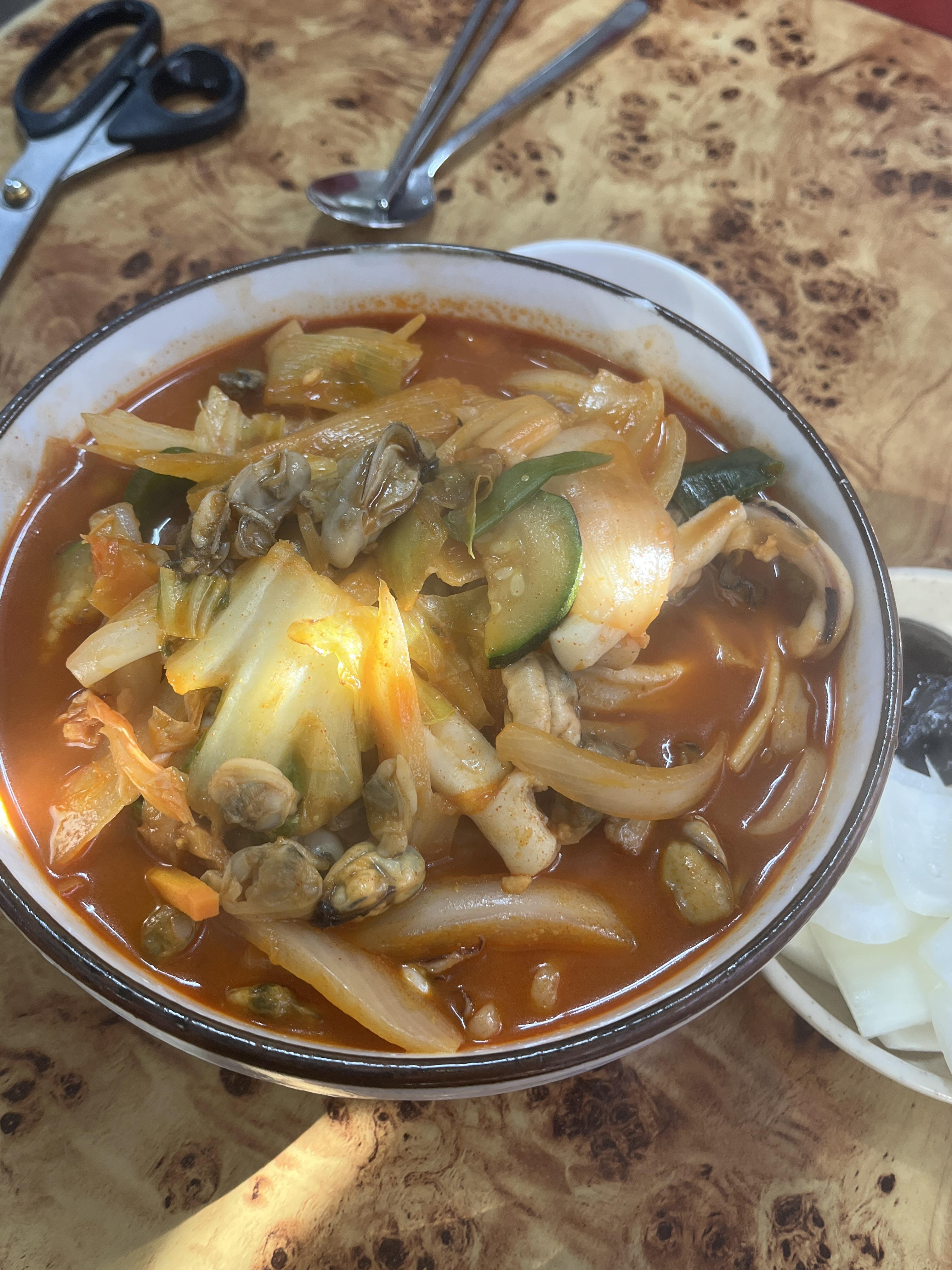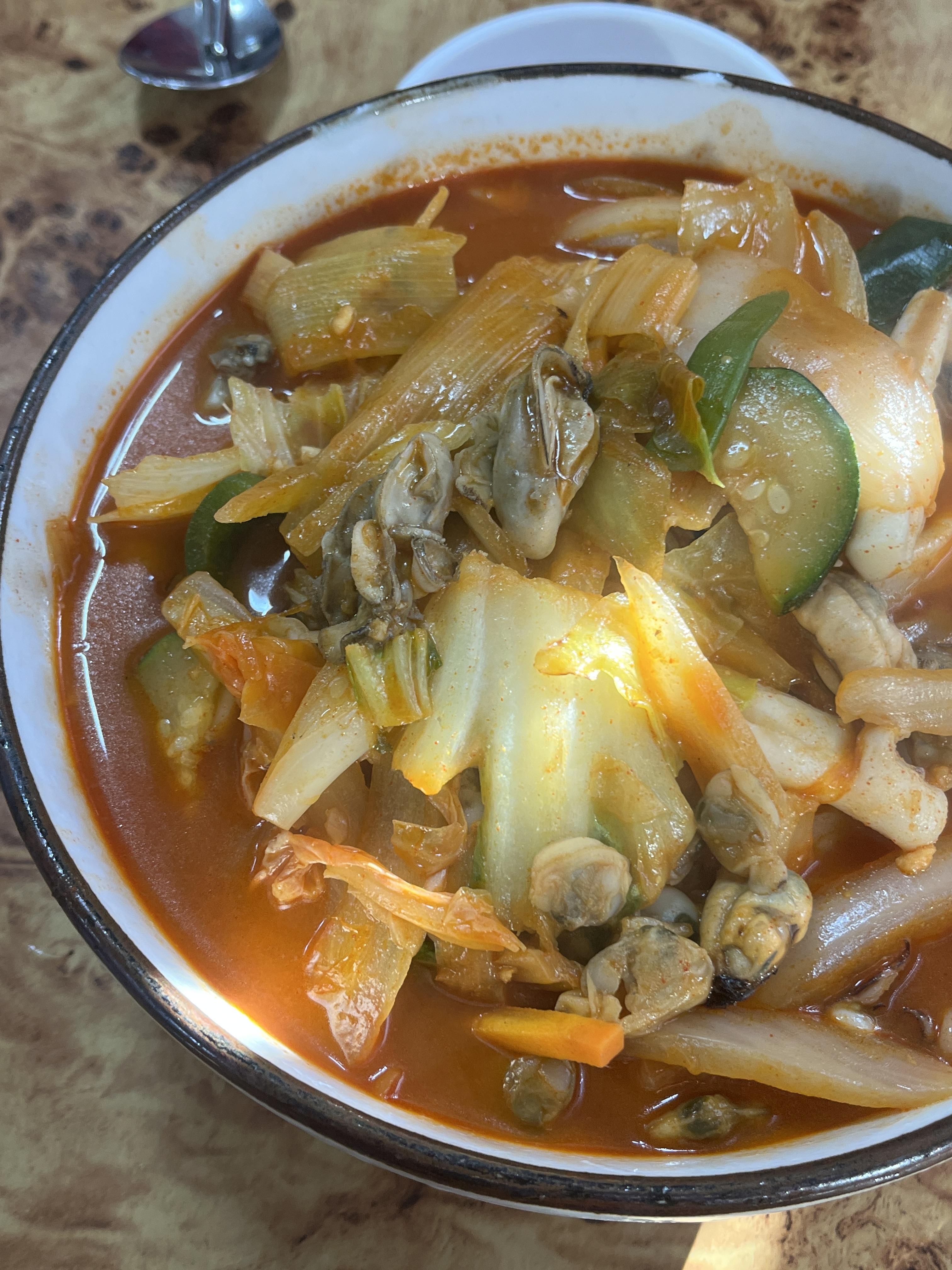 바지락 굴 홍합 오징어 푸짐하게 들어가고 조개류들은 껍질이 없어 발라먹을 필요가 없기 때문에 깔끔하게 드실 수 있습니다. 양파 배추 애호박 당근 등등 야채도 많이 들어가는 성남 짬뽕 맛집 뿅의 전설 야탑본점.
