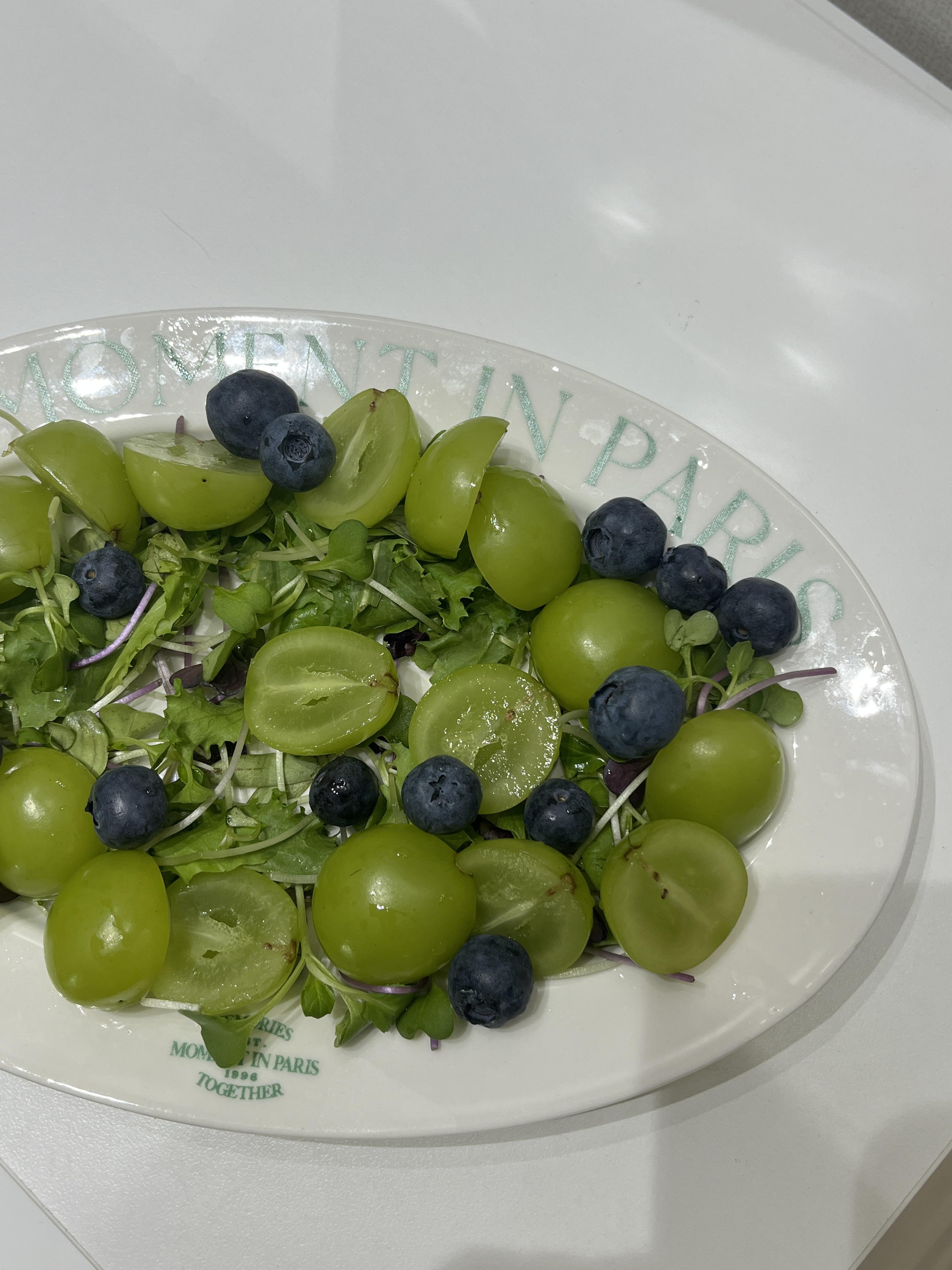 깨끗하게 씻은 어린잎채소와 샤인머스켓, 블루베리를 접시에 가득 깔아주었습니다.