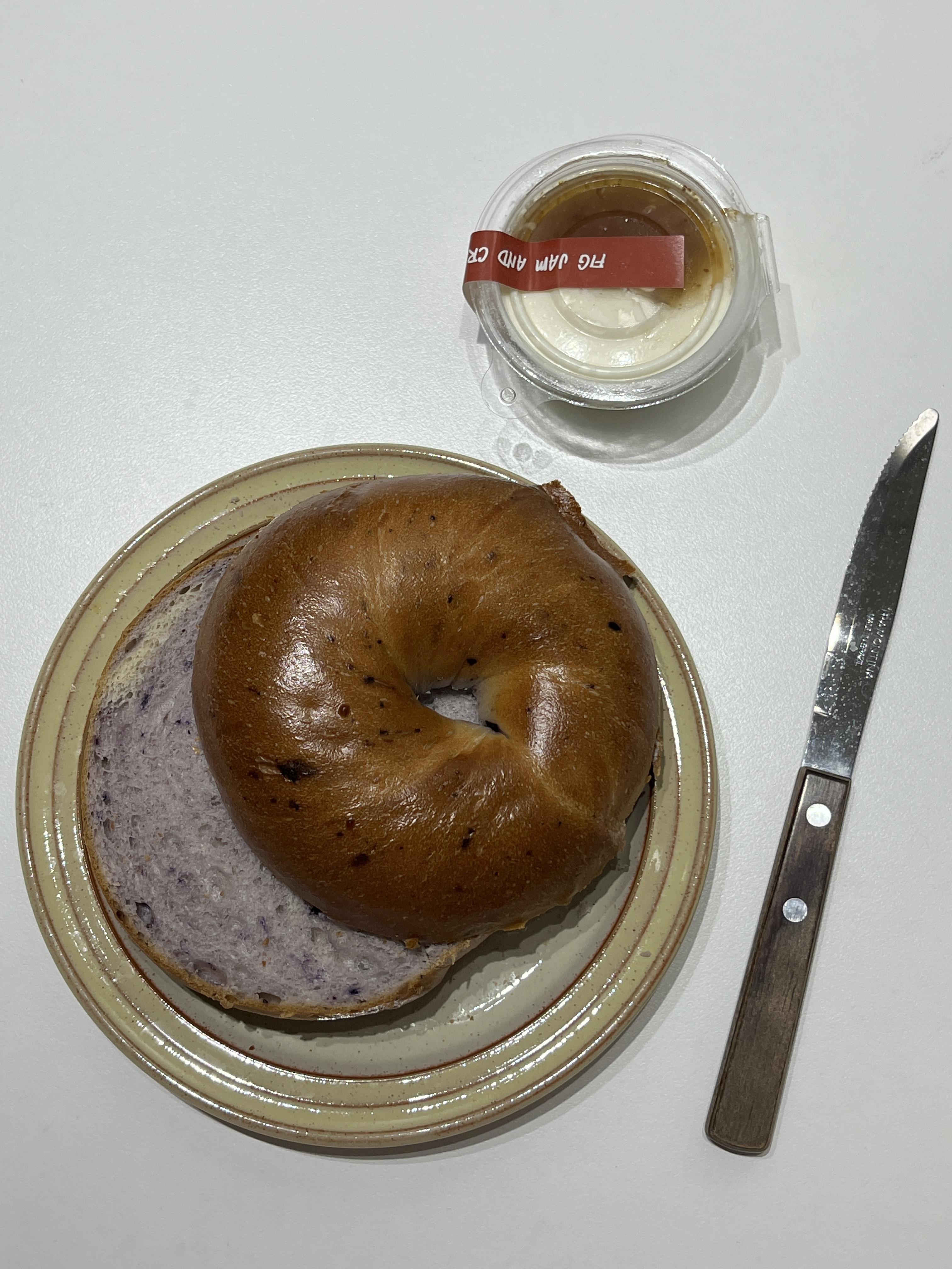 저녁이라 간단하게 베이글 하나에 크림치즈를 발라먹었습니다.