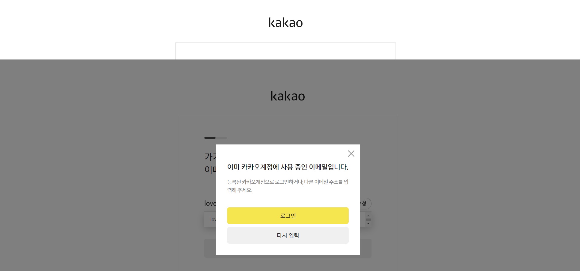 기존에 카카오계정에 가입이 된 이메일 주소를 입력하면 다음과 같은 화면이 나옵니다. 그럴떄는 다시 입력 버튼을 클릭 후 카카오 계정에 가입하지 않은 이메일 주소를 입력하여 인증요청을 해줍니다.